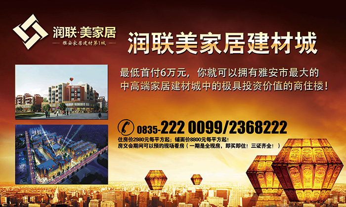 潤聯(lián)美家居建材城,位于四川雅安市,由香港潤聯(lián)國際投資有限公司投資,雅安市潤聯(lián)投資置業(yè)有限公司開發(fā)并傾力打造的雅安市中高端家具建材飾品以及家裝一體化的大型生態(tài)型家居購物MALL。